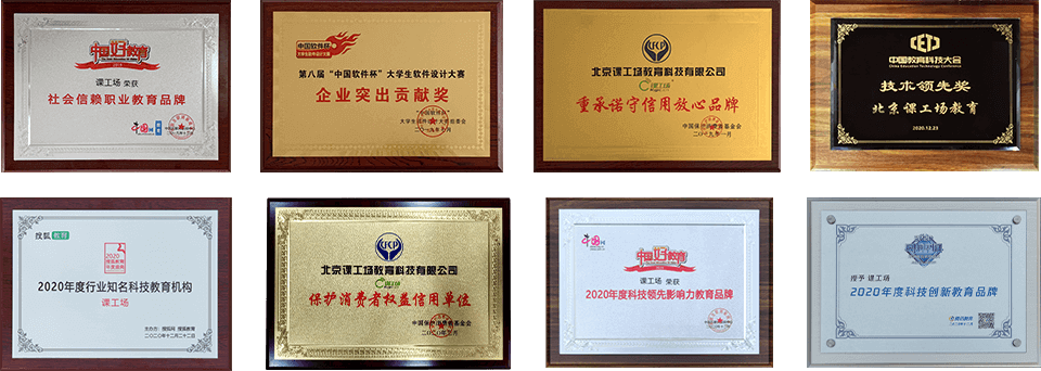 课工场从2015年至今连续多次获得腾讯、新浪等IT行业巨头认可的年度影响力教育品牌、用户信赖教育机构以及消协基金会授予的《2018年质量放心用户满意双优品牌》。